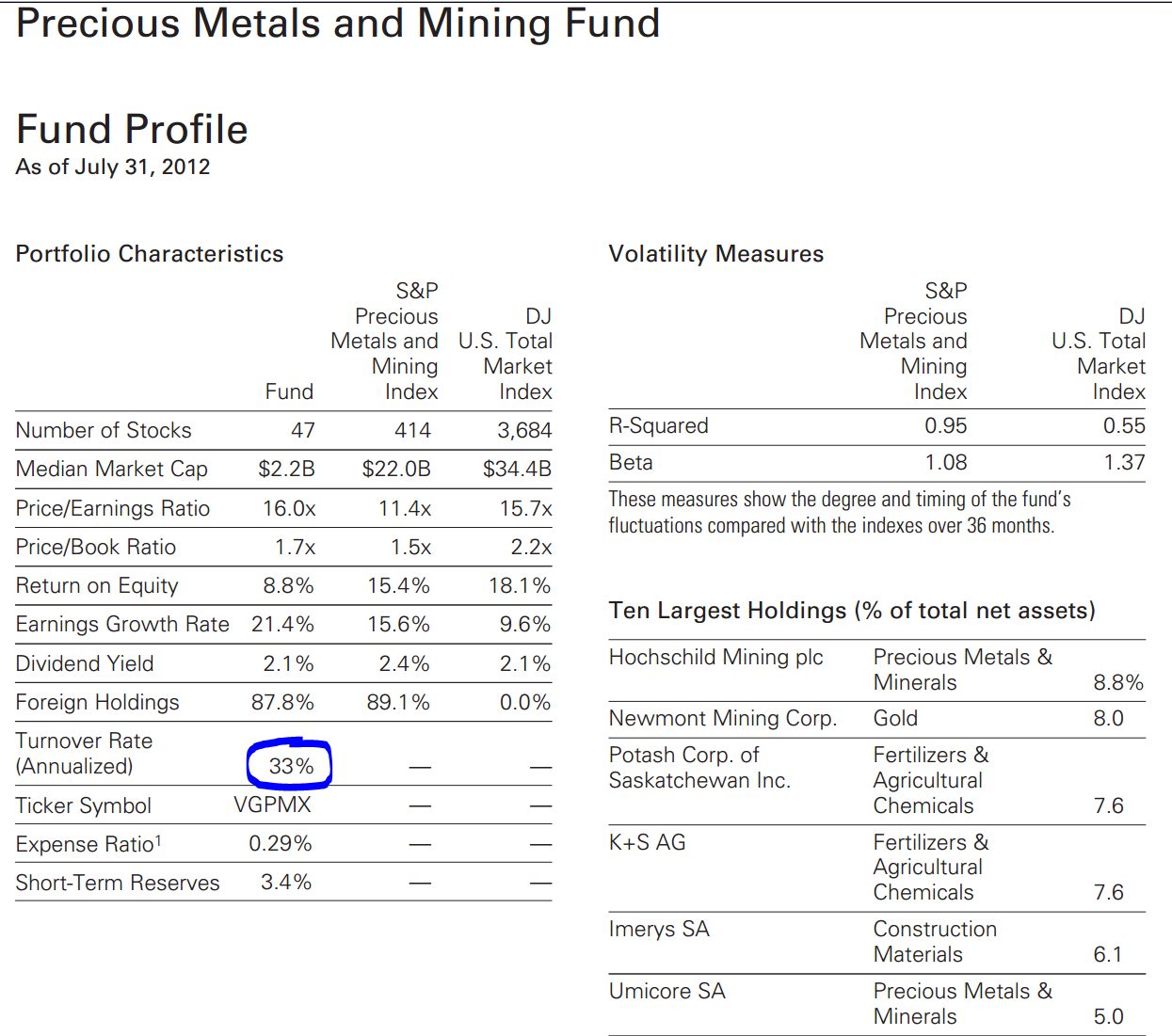 Although morningstar gives it a Gold rating, I was disappointed to discover (see p. 14 of 2012 annual report) that the # of stocks comprising the fund is only 45. Comapre it to 424 stocks that comprise S&P Precious Metals and Mining Index. Also only about 60% of the fund is invested in gold stocks. From p.5:
