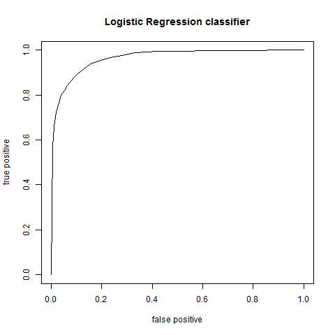 plot(fp,tp,type="l",xlab="false positive",ylab="true positive",main="Logistic Regression classifier")