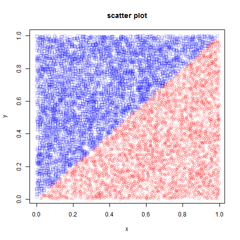 df=data.frame(x+rnorm(n,sd=0.1),y+rnorm(n,sd=0.1),as.factor(x>y))