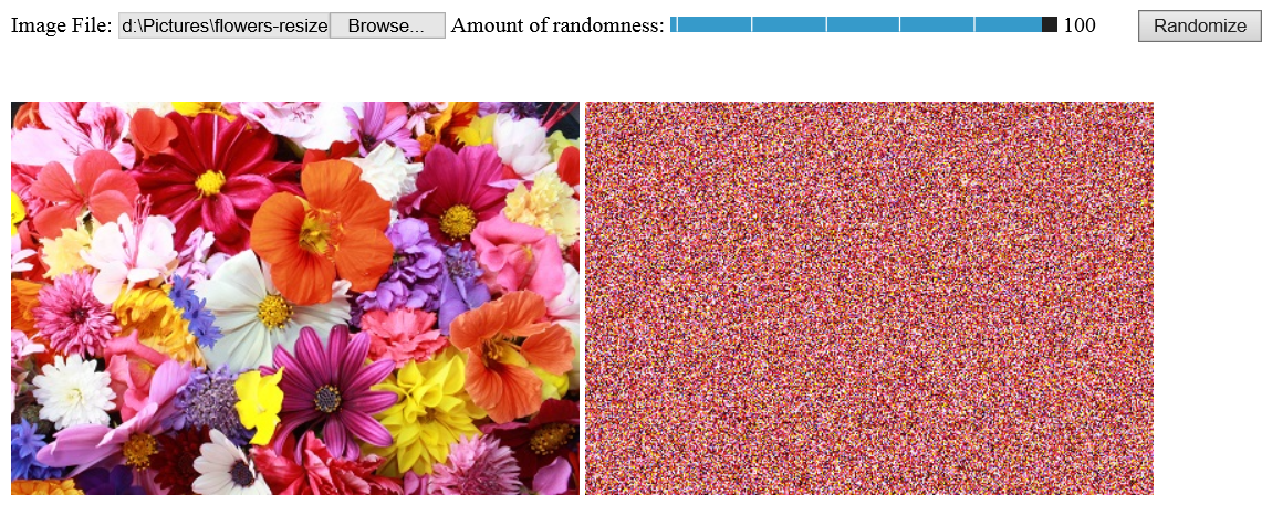 Yesterday I had the idea of making a toy program that would randomize the pixels of an image i.e., pixel (i,j) would be shuffled to appear at a random location (k,l) in the image. In other words, the program creates a random permutation of the image. You can find it here and a screenshot is copied below: