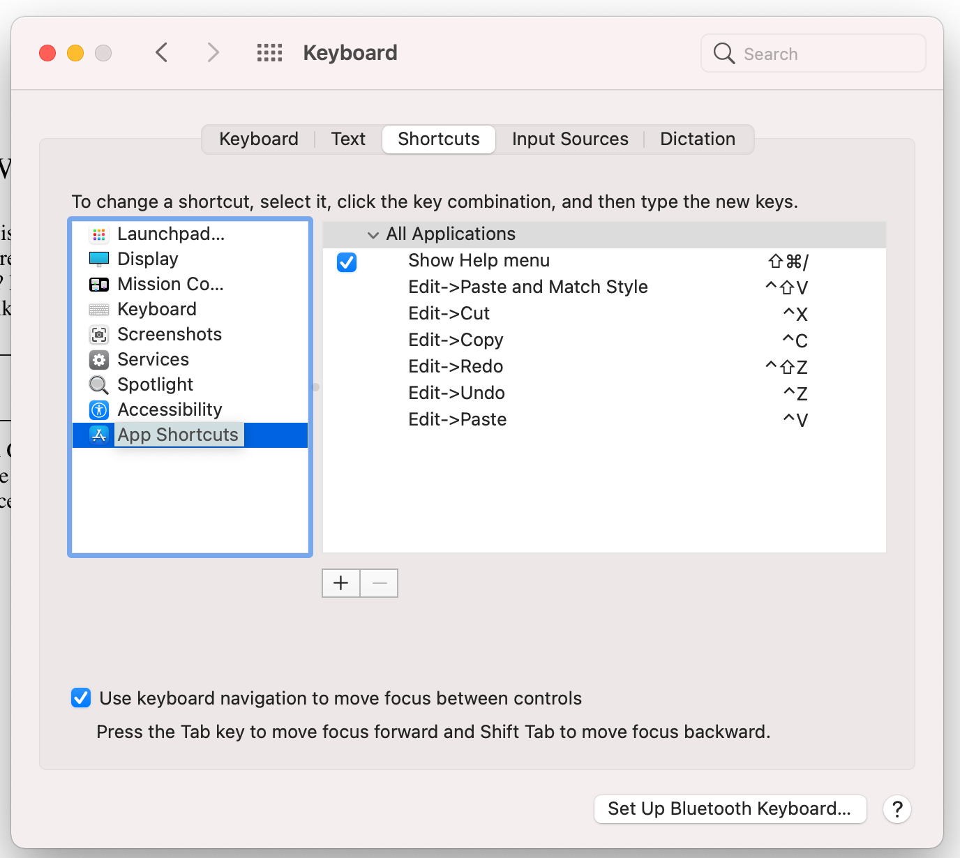 - Under System Preferences -> Keyboard -> Shortcuts -> App Shortcuts you can change the keyboard bindings to do a task. Example is shown below where I have changed the keyboard bindings to do Copy, Paste etc.