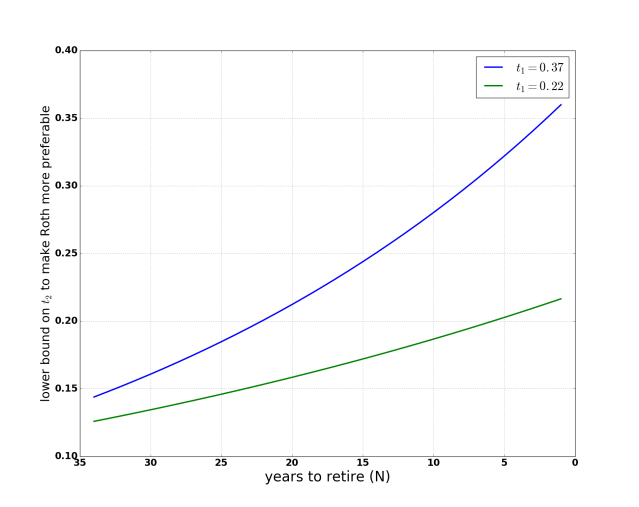 Enough math. Can I get it in English please? Investing in Roth makes sense if you are young (i.e., N ↑) or in a low tax bracket ( ↓). For most people, both these events happen at the same time. To use the graph above, calculate the # of years you have till retirement (x-axis) and your expected tax bracket in retirement (y-axis). That should give you a point on the graph. If that point is above the curve, you are better off investing in a Roth 401k.