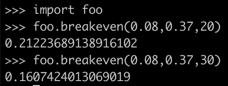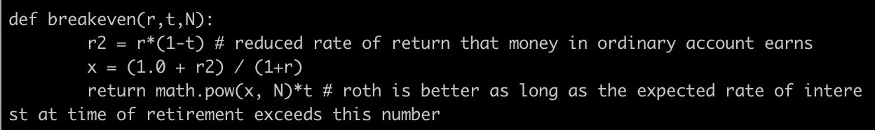 We can write a small function that gives us the breakeven point when both Roth and Traditional will give same return:
