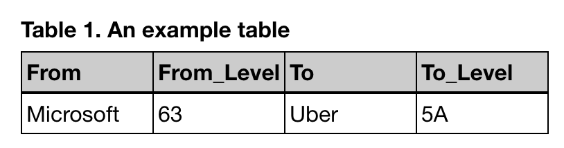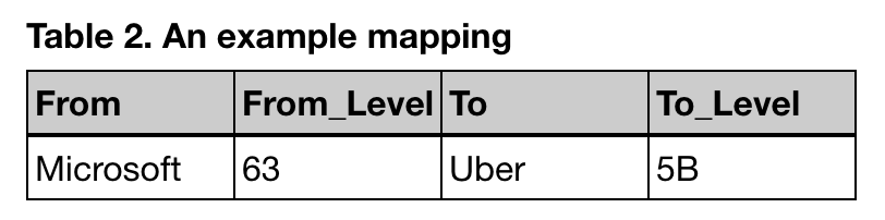 That gives mapping of level x in Microsoft to Uber. Call it M(Msft,x,Uber) = M(from,level,to)