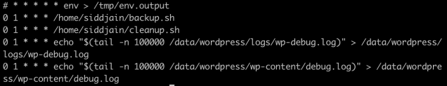 $ cat /tmp/env.output HOME=/home/siddjain LOGNAME=siddjain PATH=/usr/bin:/bin LANG=C.UTF-8 SHELL=/bin/sh PWD=/home/siddjain