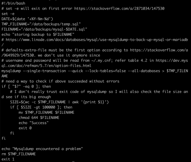 But we need to automate this and protect the password. This is done by following the steps at https://www.linode.com/docs/databases/mysql/use-mysqldump-to-back-up-mysql-or-mariadb/.