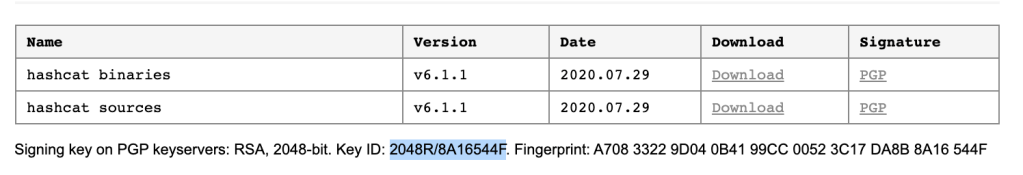 $ wget https://hashcat.net/files/hashcat-6.1.1.7z.asc --no-check-certificate