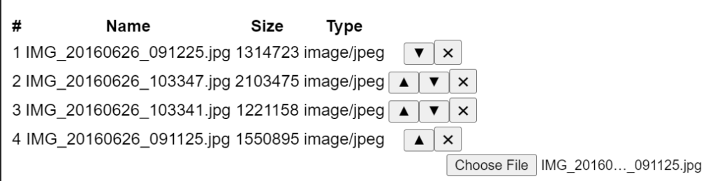 The heart of the component will be a list object which is nothing but the list of files that the user has selected. The order of items matters in this list. This list is used to render a HTML table which displays metadata about a file (such as filename, size file type etc.) together with buttons to reorder items in the list or remove them. A picture is worth a thousand words so see the example below: