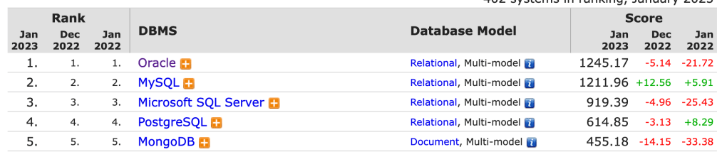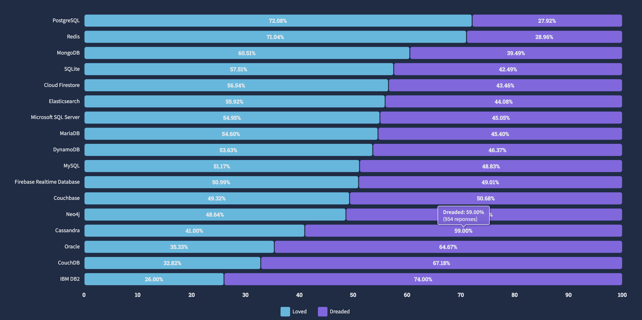 Another oddity: Oracle is one of the most dreaded databases per SO developer survey with 2 people voting it down for every thumbs up (2:1 ratio of dreaded:loved). However its the #1 database on db-engines.com rankings: