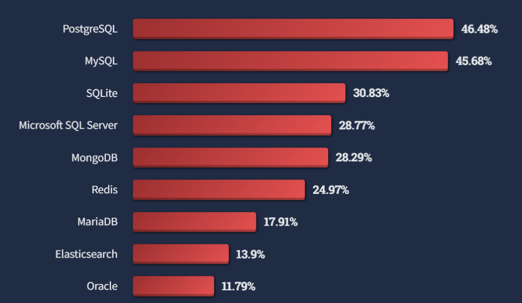 Among professional developers, MySQL and Postgres are actually tied in terms of usage: