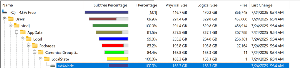 All WSL2 data is stored in this file c:\users\siddj\AppData\Local\Packages\CanonicalGroupLi...\LocalState\ext4.vhdx