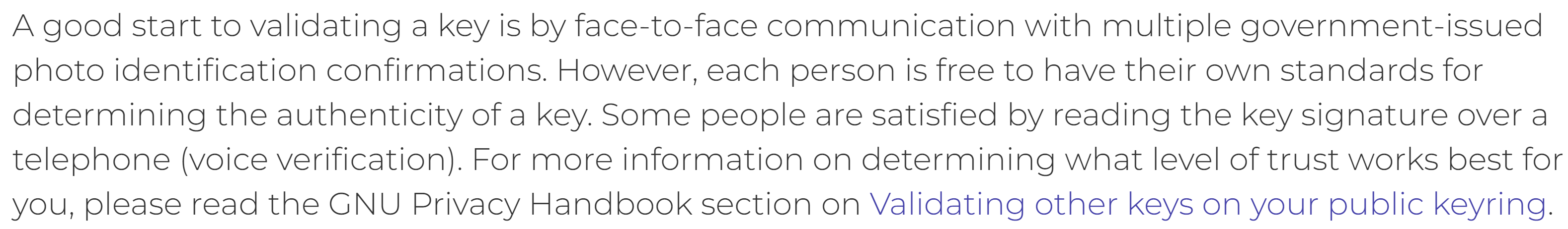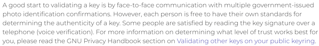 We are done now – but read the full article for a caveat emptor. To add the key to our web of trust, we can either sign it ourselves (equivalent to self-endorsement – see this for details) or we will have to find someone in our web of trust who trusts that key. Left as exercise.