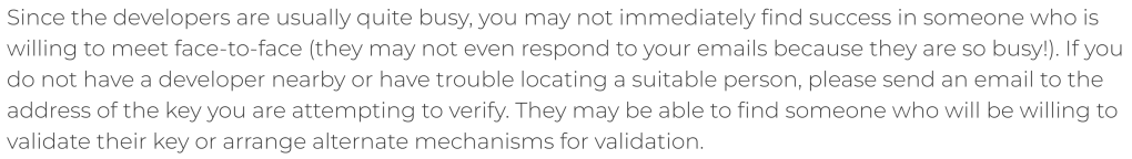 What this is saying is that the signature is by a person who is not in your web of trust – imagine receiving a signed paper document from someone you don’t know or trust. At this point most people assume everything is well – who’s going to bother with this: