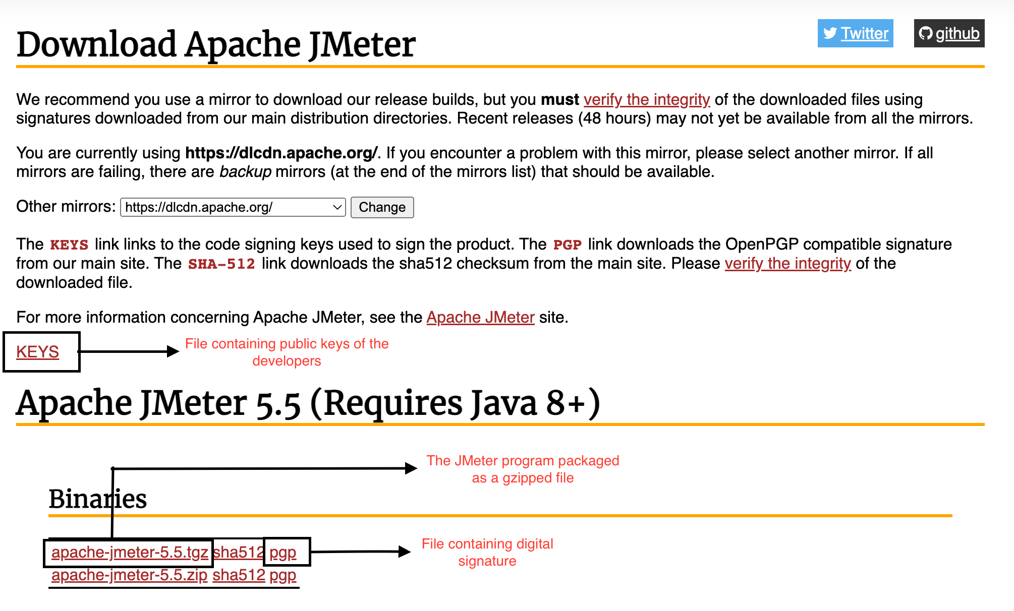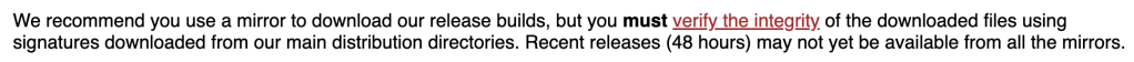Frequently we download binaries from the internet. How do we know they are genuine and not been tampered with? (Genuine as in genuine auto parts). This post illustrates the process using the JMeter library as example and downloading to MacOS. Steps on Linux should be similar. The download page for JMeter is here. It stresses not once, but twice that you must verify the integrity of the file.