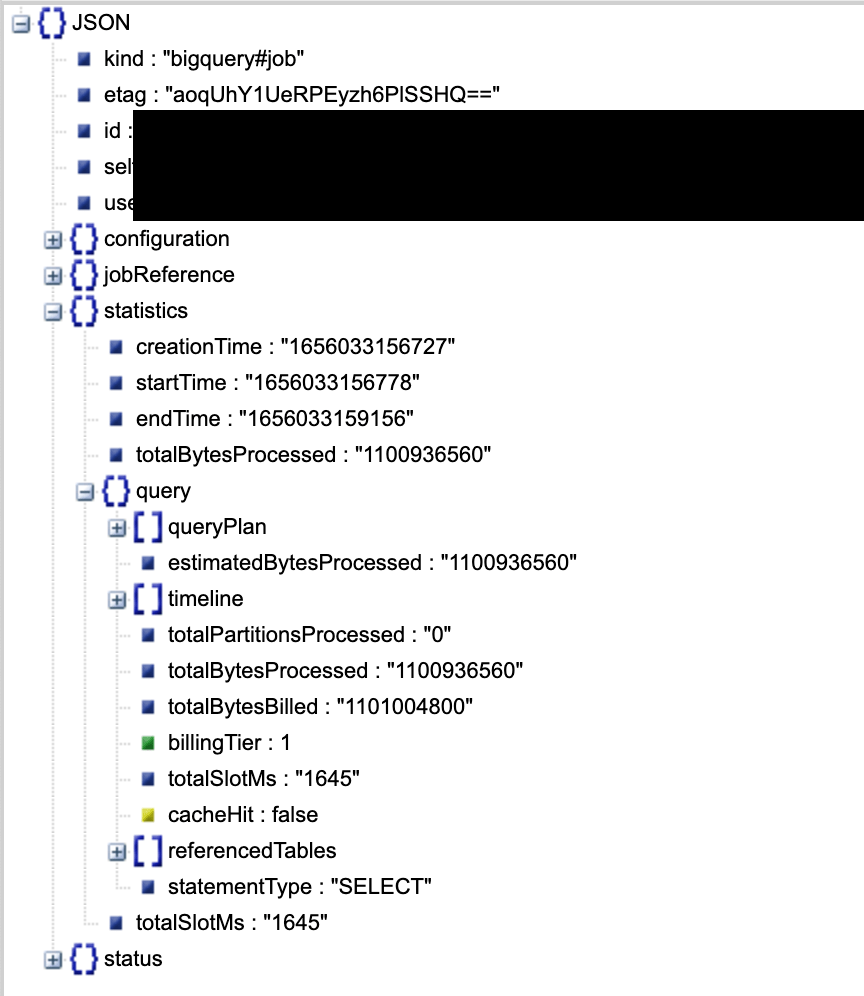 Retrieve the job details using below script. Make sure to change the Job ID. You can get the Job ID by viewing your request history in BQ on console.cloud.google.com. Look for the Personal History or Project History in BQ console.
