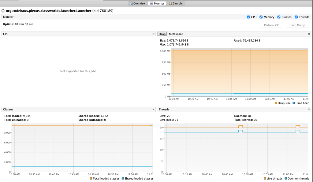 The only missing piece (and unfortunately the reason I wanted to use VisualVM) is the Threads view that I was not able to get working. I was esp. interested in it because I wanted to see how many threads are blocked when I make calls to MySQL in my Spring app. I tried running my program with