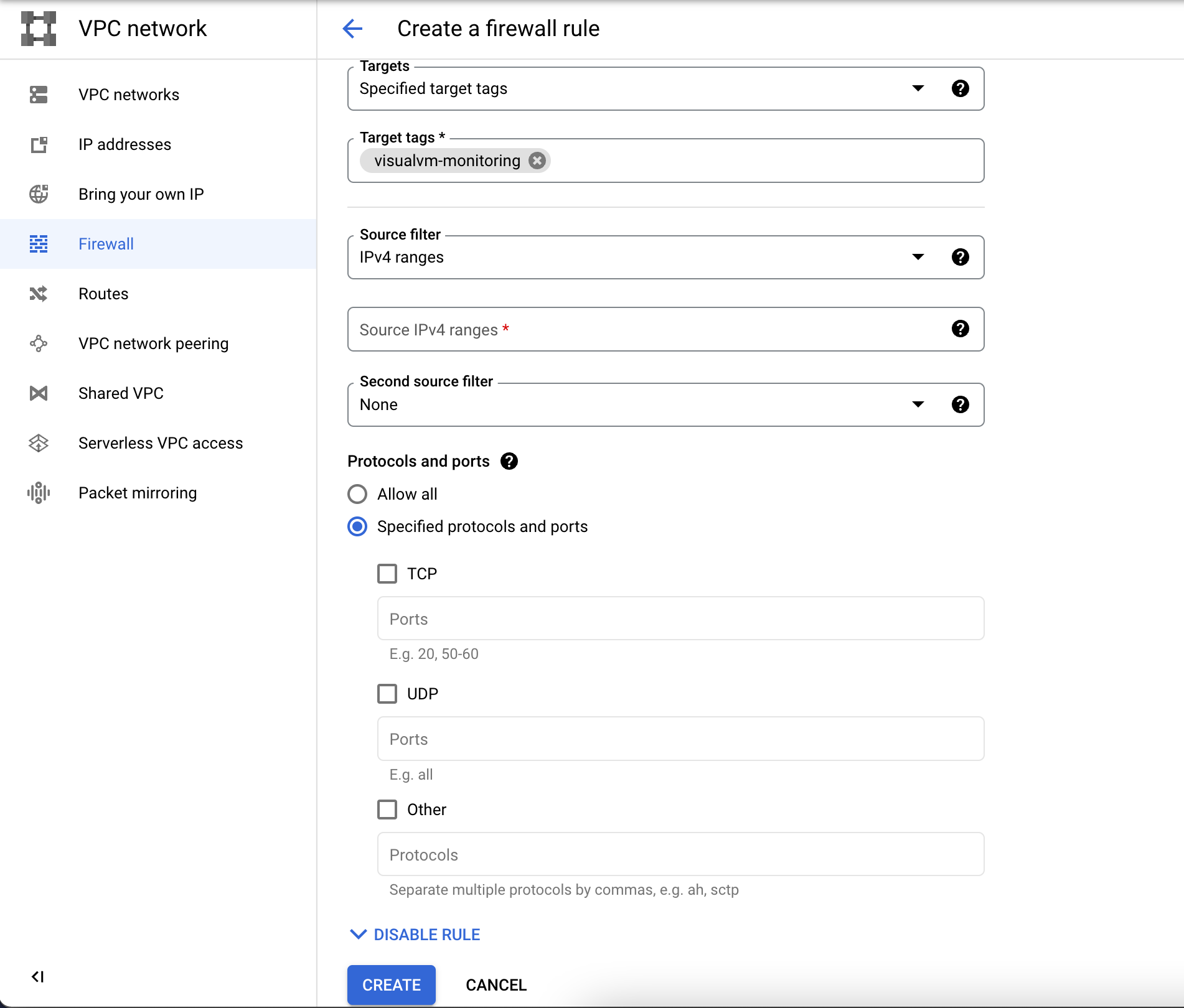 visualvm-monitoring. You can name the tag anything you want. You will need it in the next step. - Then, goto VPC Network and create a rule. Here you will use the tag in step 1