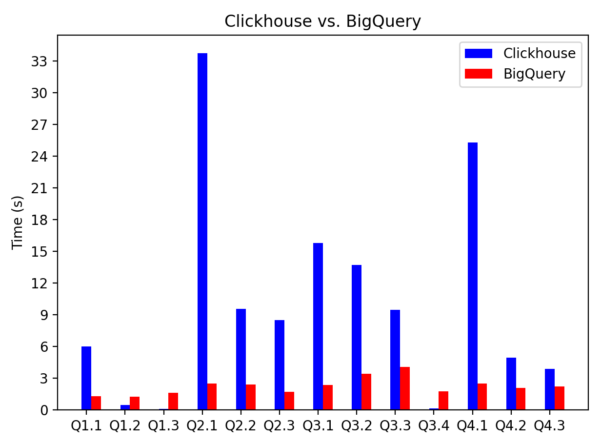 We can easily see BigQuery is faster. I suspect this is because Clickhouse was run on a single node (8 vCPUs and 32 GB RAM). E.g., when the job details of Q2.1 were inspected,