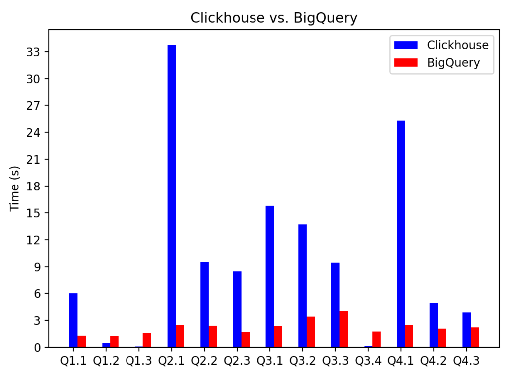 | BigQuery (s) | ClickHouse (s) | DuckDB (s) | |