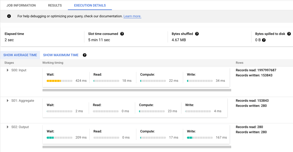and drilling further, it was seen there were 3847 parallel inputs in Stage 1 (S00). Both BigQuery and Clickhouse did a full table scan but BigQuery massively parallelized the work across 3847 workers (slots). Its hard to beat this. The total slot milliseconds of BigQuery came in at 311,716 ms.