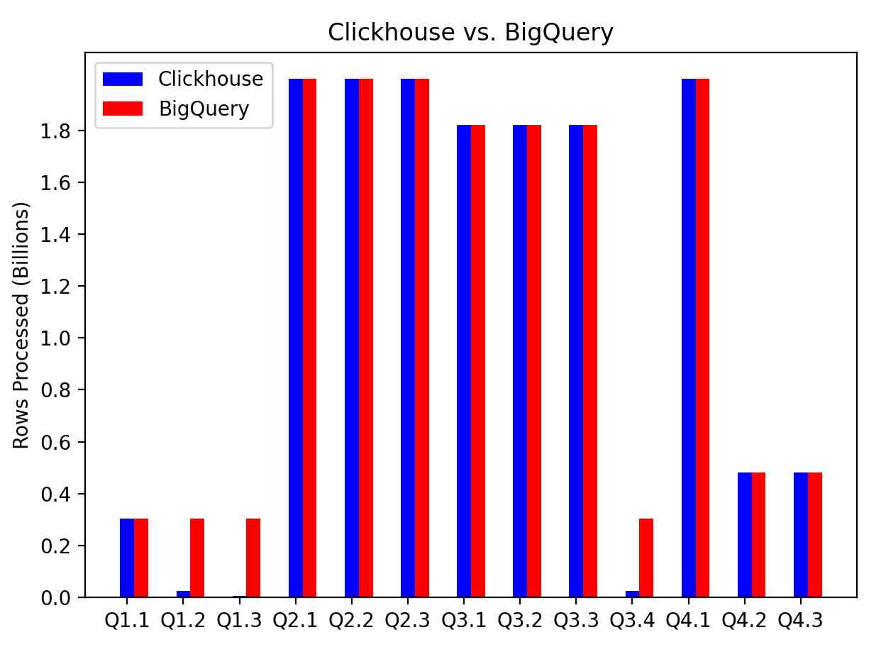 It can be seen that the cases when Clickhouse is faster (Q1.2, Q1.3 and Q 3.4) can be attributed to scanning through a much smaller subset of the data. In all these cases the query had a where filter which was more fine-grained than just the year. E.g., in Q1.2 has predicate on month, Q1.3 has predicate on ISO week and Q3.4 has predicate on month again.