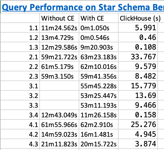 And below are the execution times on the SSB queries before we added the columns and after we added the columns. The execution time of ClickHouse is shown for comparison: