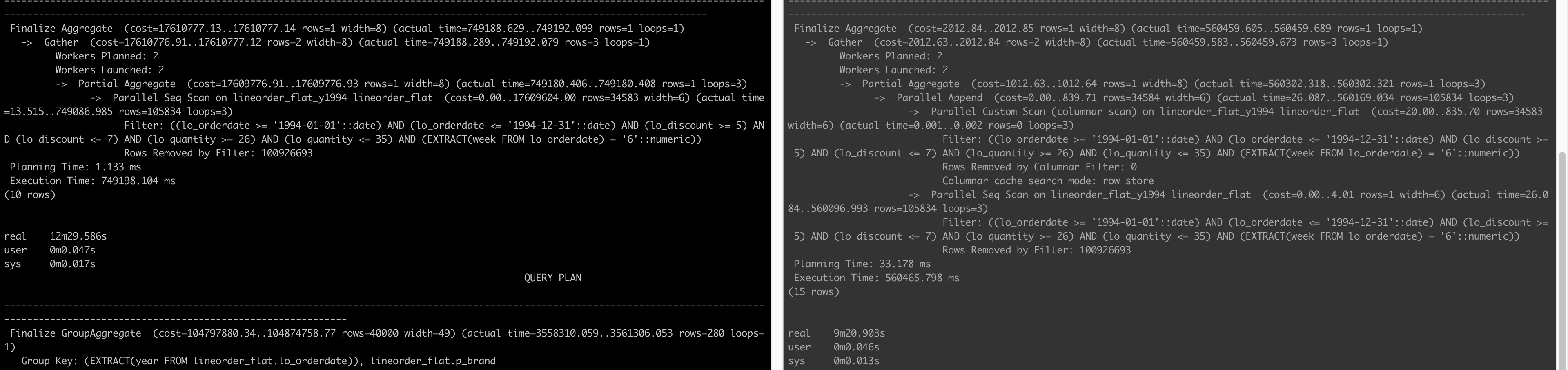 We see on the right that although it does a Parallel Custom Scan (columnar scan), the Columnar cache search mode is row store as opposed to native in queries 1.1 and 1.2. In the end, the column store is not able to make the query faster.