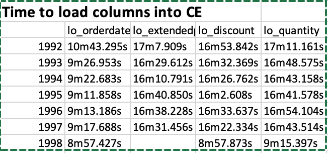 Similarly, query 1.3 takes long even though all the columns it depends on are in the CE. This is because of the presence of extract(week from LO_ORDERDATE) in the query: