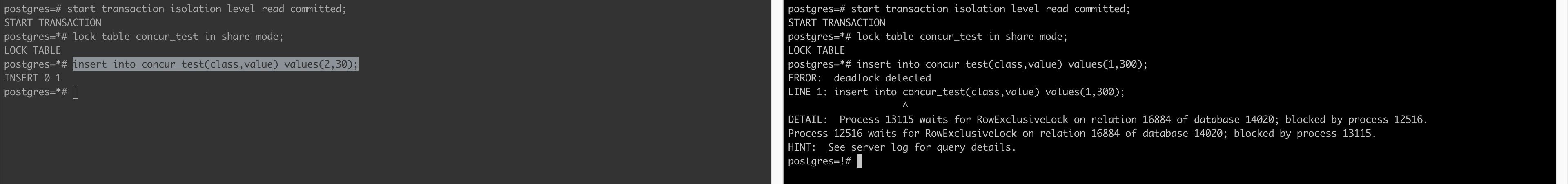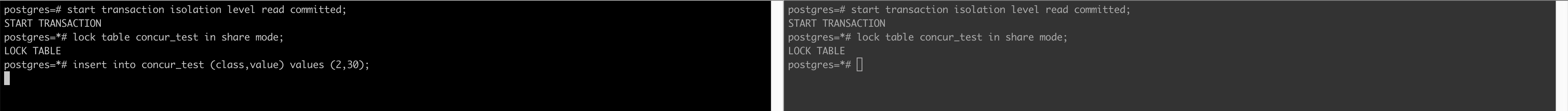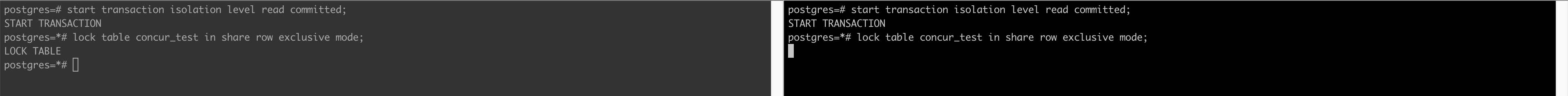 Ok, so this is a bug I made but how to fix this problem really. so far we haven’t solved the problem we set out to solve. Lets see what happens if we try to use SHARE ROW EXCLUSIVE lock mode: