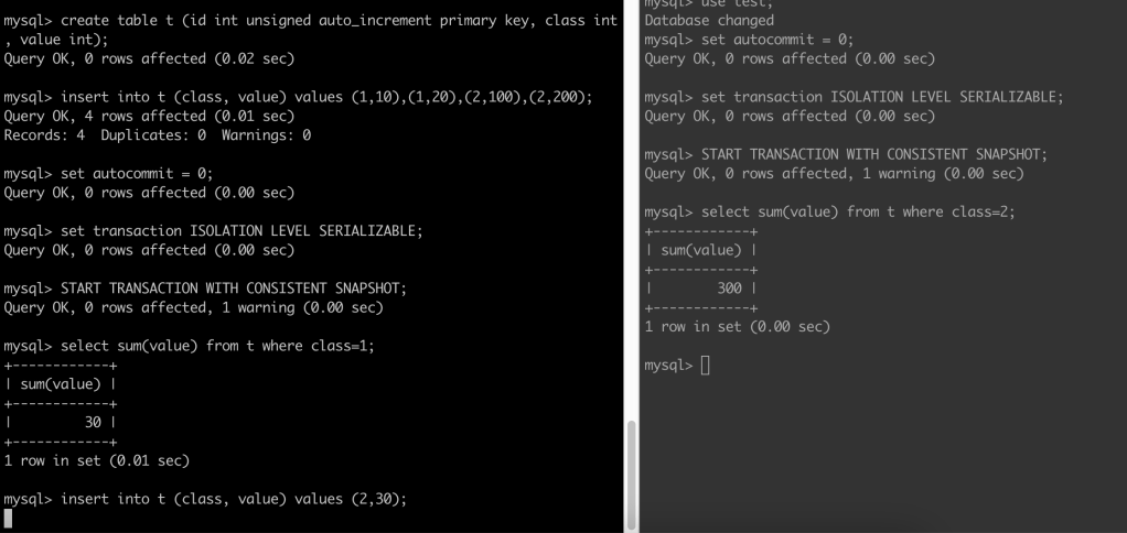 It is very instructive to compare the difference between Postgres and MySQL when using the SERIALIZABLE level using the example in section 13.2.3. You get the same end result but the internals are different. In case of PG there is no locking (refer docs) whereas in case of MySQL there is locking which manifests itself as one transaction waiting on another to complete as seen below: