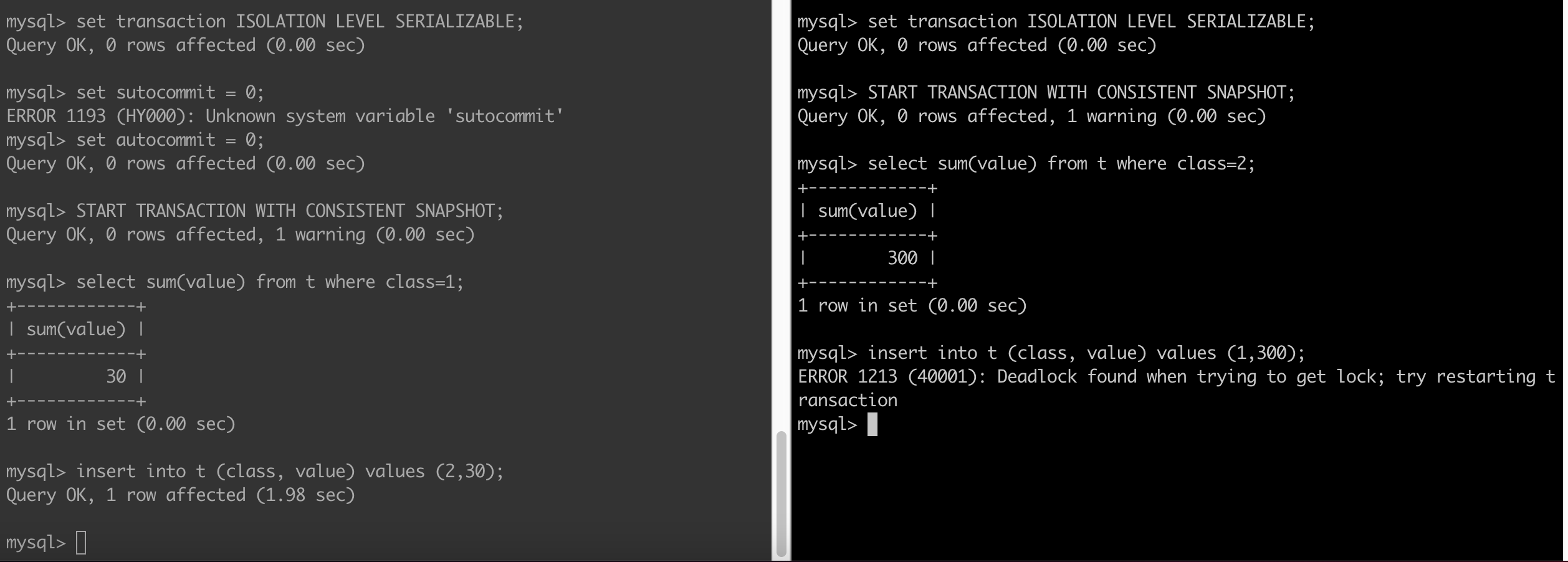 If both transactions try to commit, MySQL will detect a deadlock and abort one of the transactions: