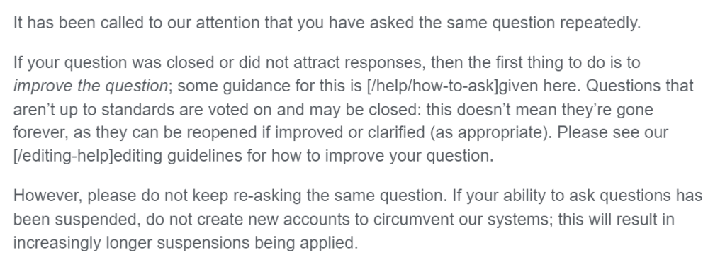 Finally, SO – by design – does not want people to ask questions that do not have a well defined answer. Such questions are promptly closed and again the moderator community makes up BS reasons for this design. The problem is that its only simple questions that have well-defined answers. As I have moved up in my career, most of my questions now are not something that have a well-defined answer. Most advanced questions need an iterative discussion with a back and forth dialogue. SO realizes this and have launched the discussions feature which is a step in the right direction.