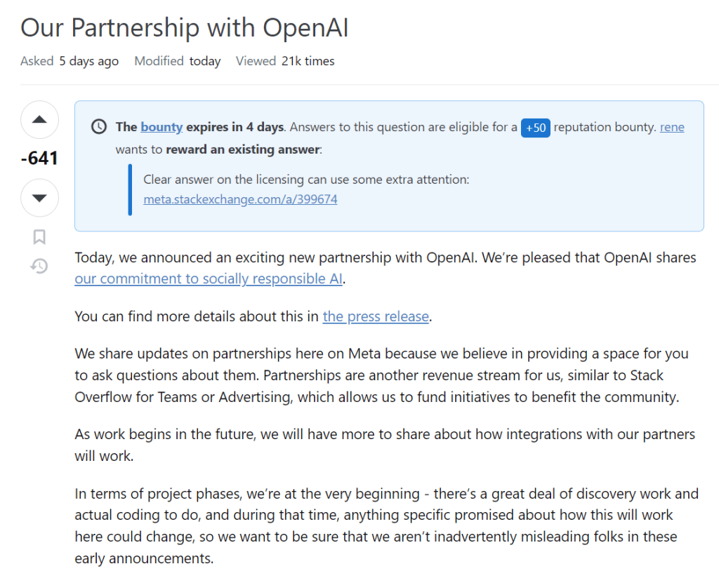 what do i think about this? OpenAI is going to mine SO data whether SO (and its users) like it or not. They already do so. And there is nothing SO will be able to do about it – OpenAI has deep pockets. So its actually better to strike a deal with them and at least get something in return. I know it doesn’t sound nice but its the sad reality. because of reasons like this i have now stopped posting answers on SO – all these sites benefit at your expense. i continue to post questions but here also i avoid if i can because half of the questions get downvoted for no reason at all – it doesn’t cost anything to downvote a question.